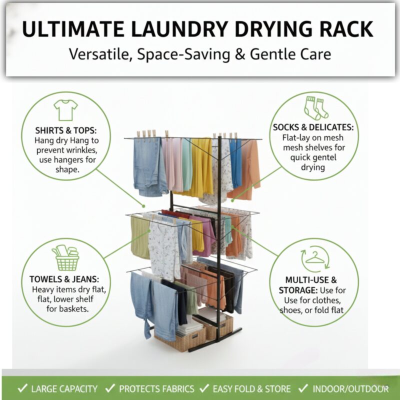 Heavy Duty 3-Tier Foldable Cloth Drying Stand with 24 Rods & 5 Hooks | Mild Steel Indoor/Outdoor Laundry Drying RackĀ
