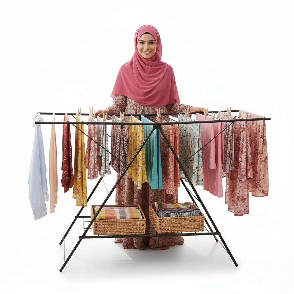 Heavy Duty 3-Tier Foldable Cloth Drying Stand with 24 Rods & 5 Hooks | Mild Steel Indoor/Outdoor Laundry Drying RackĀ