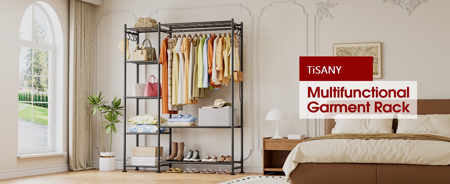 Heavy Duty Clothes Rack with Shelf and Hanging Rod, Freestanding Closet Organizer, Industrial Hall Tree Garments Rack for Small Space,Bedroom,