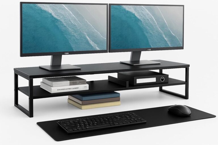 2-Tier Metal Dual Monitor Stand Riser | Computer Desktop Organizer for 2 Monitors 30″x10″ | Laptop, Printer & TV Stand | Heavy-Duty Black Steel Frame with Storage Shelf